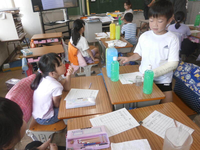 2年生算数「かさ」の学習です。グループで予想を立ててから、ペットボトルに入った