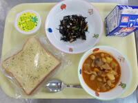 ガーリックトースト、ひじきのマリネ、ポークビーンズ、パイナップルゼリー、牛乳
