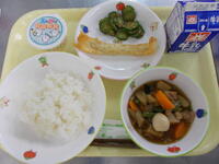 青大豆ごはん、千草焼き、中華きゅうり、インド煮、ひとくちりんごゼリー、牛乳