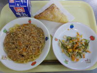 ソースやきそば、からあげサラダ、フルーツポンチ、牛乳