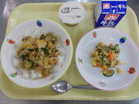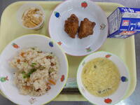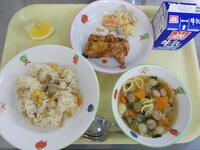 たこめし、鶏肉のから揚げ、冬瓜のかきたま汁、豆乳わらびもち、牛乳