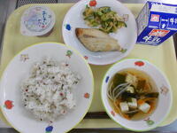 わかめごはん、いわしのレモンソース、ナムル、フルーツヨーグルト、牛乳