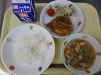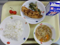 ごはん、あじフライ、ほうれん草のごまあえ、せんべい汁、さくらんぼ、牛乳