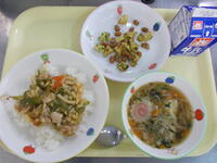 マーボードーフ丼、豆もやしとささみの中華和え、豆乳あんにん、牛乳