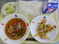 キムタクごはん、ポテトはるまき、わかめ入り春雨サラダ、豆苗とたまごのスープ、牛乳