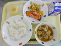 ごはん、さけの生姜焼き、たくあんあえ、肉じゃが、冷凍ピーチ、牛乳