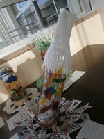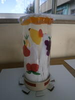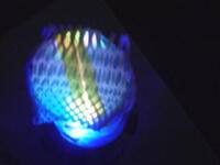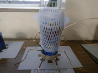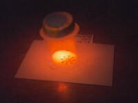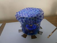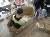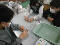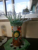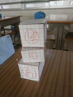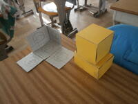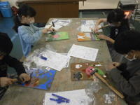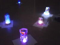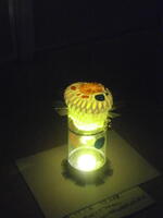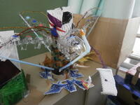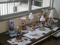 ペットボトルや家にある材料を使って作りました。暗い中で作品の中の光をつけると・・・ この後、視聴覚室を暗くして鑑賞会も行う予定です。