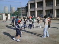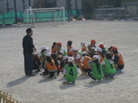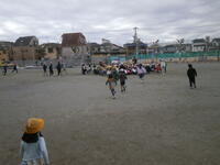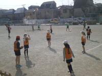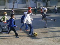 朝学習の時間に4年生と2年生が校庭でサッカー、縄跳び、ドッジボールなど元気に交流を深めました。
