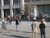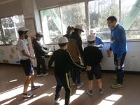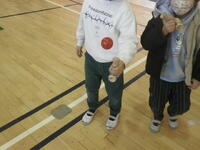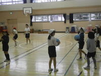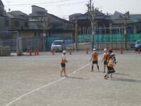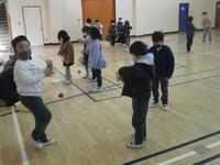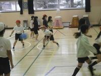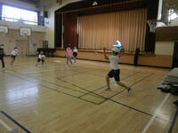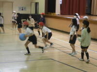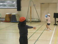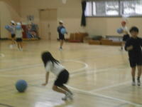 大きなソフトバレーボールでキャッチボール練習の後、2チームに分かれてドッジボールです。ナイスキャッ~チ、できたかな?