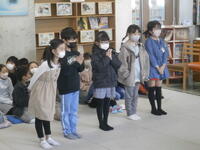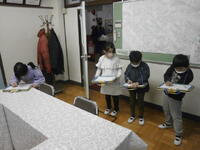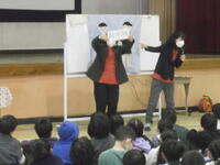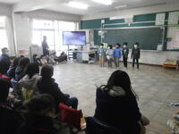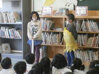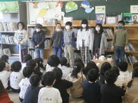 2年2組の子どもたちが、1年2組の子どもたちに国語の授業で学習した『かさこじぞう』の音読劇を披露しました。グループごとに場面を分け、どうどうと発表できました。一年間の成長は早いものです。