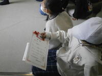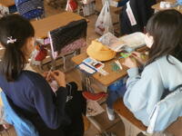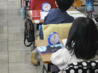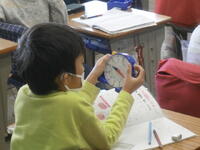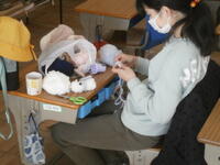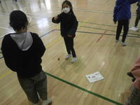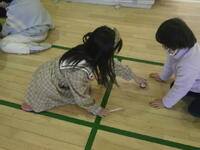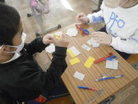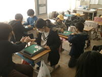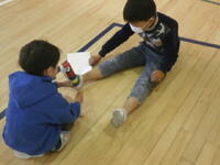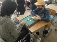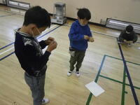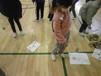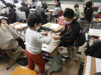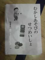 2年生が1年生にけん玉、だるま落とし、おはじきなどの昔あそびを教えています。2年生は、遊び方をどう分かりやすいように説明するか準備をしてきました。