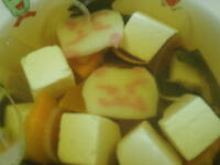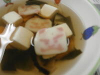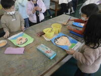 給食も節分にちなんだメニューで、すまし汁の中には、鬼の顔のかまぼこが入っていました。