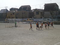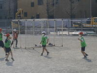 校庭でハンドボールの授業です。元気いっぱいです。シュートが決まった後はその都度、アシスト役やボールに触れた人等、振り返りをしながらゲームを進めています。