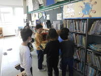 図書館で読書の時間です。読んだ本の記録を書き、新しい本を選んでいます。みんな読書が大好きです!