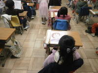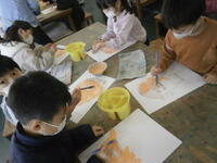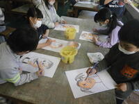 1年生がお世話になった6年生の似顔絵を描いています。感謝の気持ちが絵にあふれています。