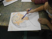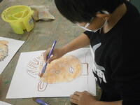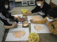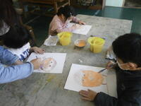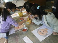 顔に肌色を塗った後は、みんなで相談しながら唇の色を作っています。