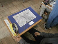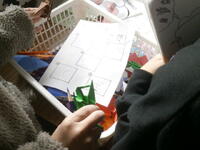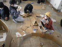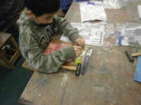 自分で絵を描いた板に、釘をトントン打って、ビー玉の転がるコースを作っています。