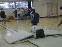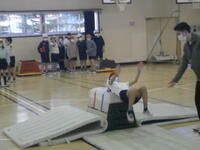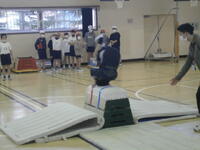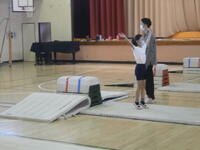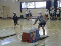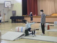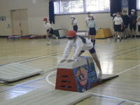 跳び箱の授業です。ポイントを押さえて、着地まで決まっています。