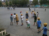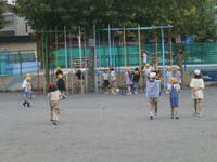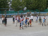 校庭では、2年生と4年生が交流活動として、学年の枠をはずし、仲よく遊んでいます。