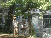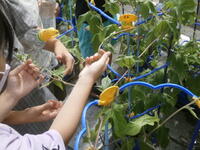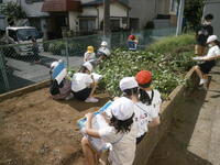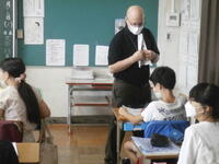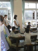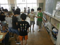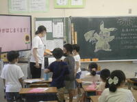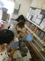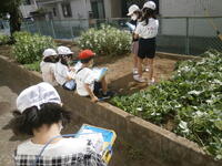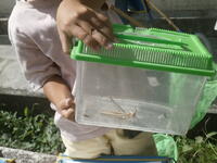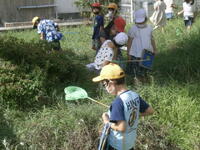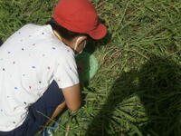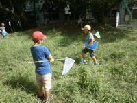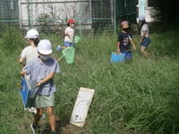また2年生のほかのクラスは、虫取りに挑戦です。中庭には、池にはカエル、草むらにはバッタやカマキリ、蝶などいろいろな生き物がいます。捕まえて観察した後は、逃がしてあげています。