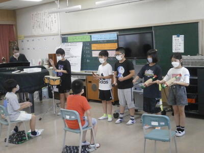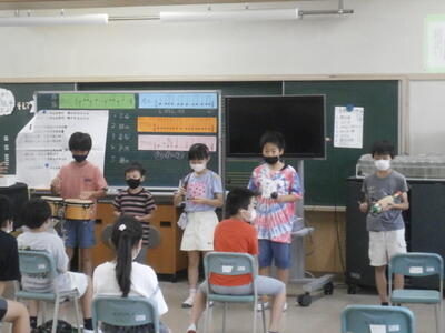 グループごとに演奏を発表していきます。聴いている子どもたちも演奏に合わせ、ノリノリです。