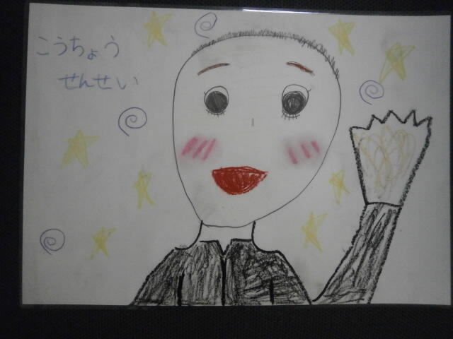 1年生の女の子が、校長先生の似顔絵を描いて持ってきてくれました。なかなか特徴をとらえ、実物よりかなり若々しく描いてくれました。以前に男の子が描いてくれたものと併せて、校長室の入り口ドアに貼ってありますので、来校の際には、ぜひご覧ください。