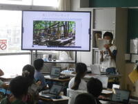 自分で選んで調べたテーマに沿って、タブレットを使用しクラスで発表しています。見ている人は、それぞれの良いところを評価しています。