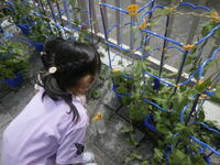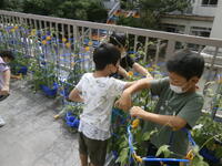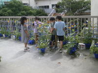 2年生が中庭で育てているサツマイモを観察しています。裏側にも日光が当たるように葉を裏返しています。大きく育つといいですね!