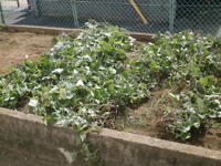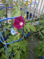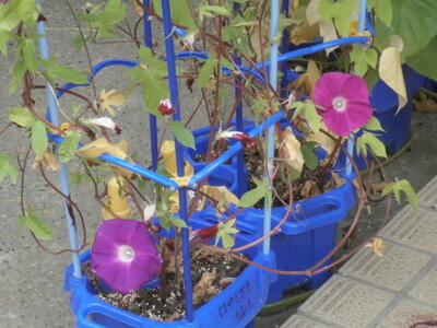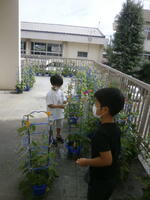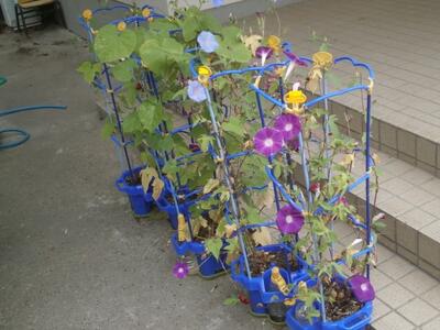 1年生が育てているアサガオに花が咲き始めました。中には、となりの蔓と絡まってしまった子も・・・