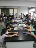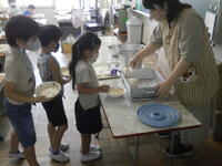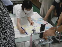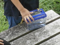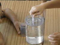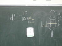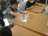 水のかさ(量)を実際の水で確認しています。1リットルは、何デシリットル・・・?