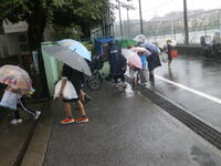 2学期のスタートです。あいにく登校時間と大雨が重なってしまいましたが、みなたくさんの荷物を抱え、元気に登校しました。