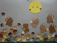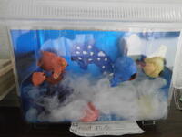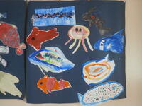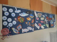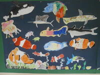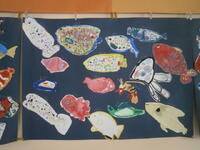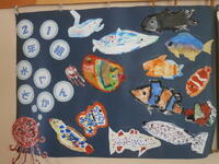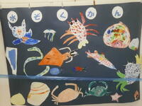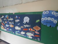 2年生の廊下に水族館ができました。きれいなお魚や海の生き物がいっぱいです。