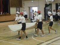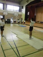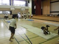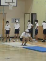 6年生2クラスが合同で体育の授業です。体育館でマット運動を行いました。