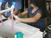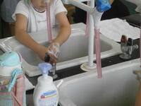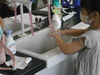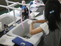 理科室で『手洗いの歌』に合わせて、手の洗い方を確認しました。洗い終わった後は洗い残しがないかチェックです。