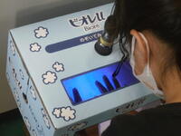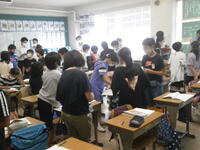理科で空気鉄砲の実験です。ポンッ、ポンッと威勢のいい音が理科室に響き渡りました。