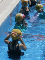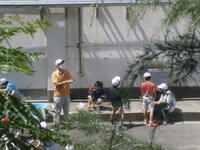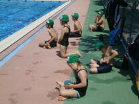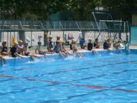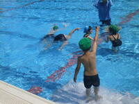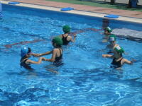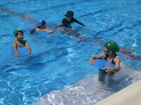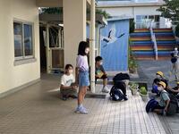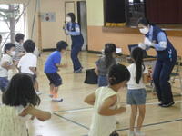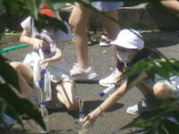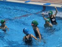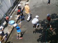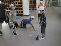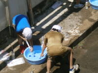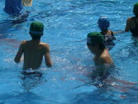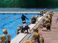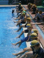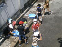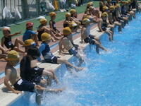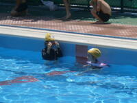 猛暑の中、絶好のプール日和です。先生が水に沈めたものを潜って(潜れない子は、足で探して)宝探しです。
