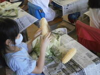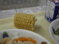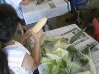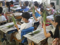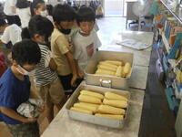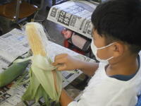今日の給食は、とうもろこし。実は2年生が全校分を一生懸命剥いてくれたものです。栄養士の先生にとうもろこしについての話を聞いた後、教室に戻り頑張りました。