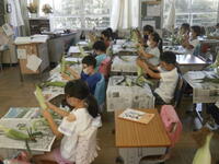 2年生が育てた野菜が実ってきました。じっくりと観察しています。