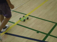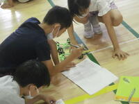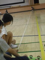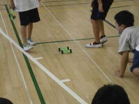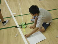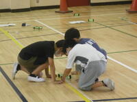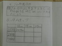 体育館で理科の実験です。ゴムを伸ばす長さをかえると、ゴム車の進む距離はどのように変わるか?真剣にデータを集めています。その結果、分かったことは・・・?