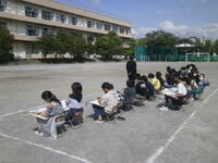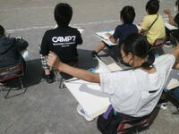 6年生が校庭で校舎の絵を描いています。思い出がいっぱい詰まった校舎、どんな絵に仕上がるか楽しみです。