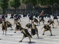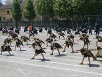 休み時間には、上級生の演技を1年生が教室の窓から熱心に眺めています。