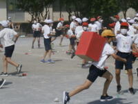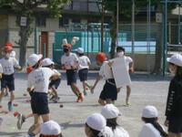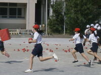 『追いかけ玉入れ』です。逃げるほうも追うほうも必死です。