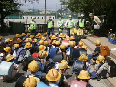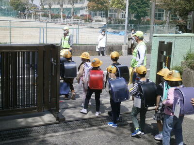 1年生は、13日まで集団下校です。見守り隊の方々に挨拶をした後、コースごとに出発です。