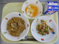 ソースやきそば、からあげサラダ、フルーツポンチ、牛乳