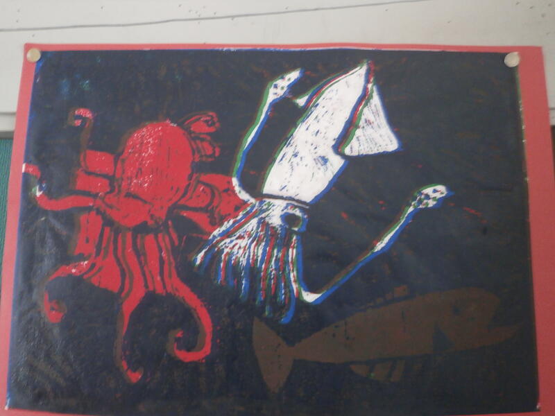 5年生の廊下に「多色刷り版画」の作品が掲示されていました。