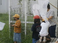 また2年生のほかのクラスは、虫取りに挑戦です。中庭には、池にはカエル、草むらにはバッタやカマキリ、蝶などいろいろな生き物がいます。捕まえて観察した後は、逃がしてあげています。