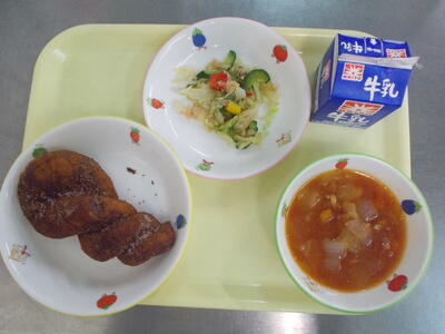 今日はメンチカツをバンズではさんで食べられる様にした給食でした。
