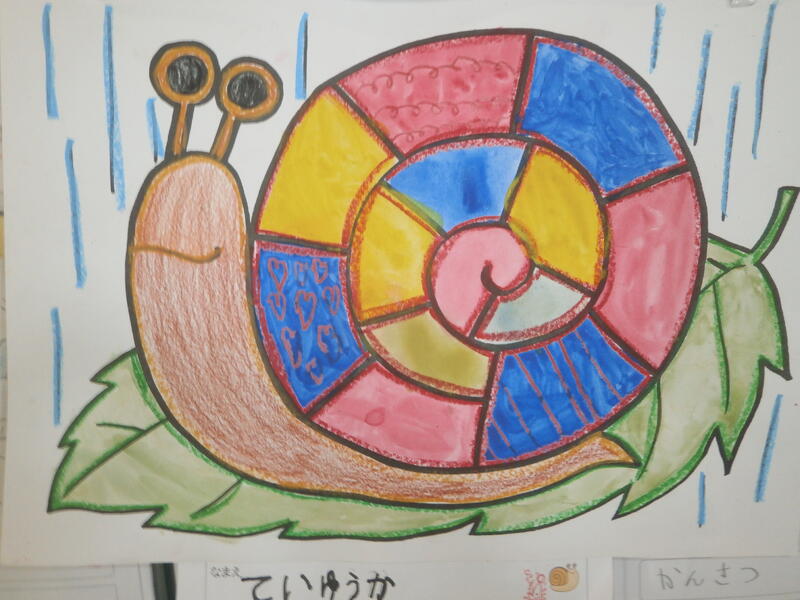 1年生の廊下に「カタツムリ」の作品が掲示してあります。