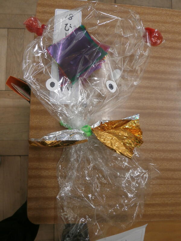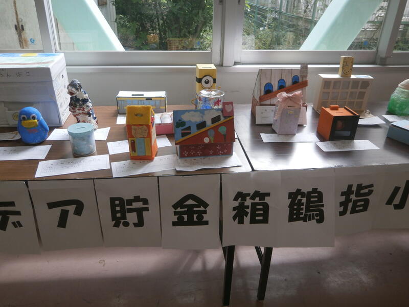 1階昇降口前には「アイディア貯金箱」の作品が展示されています。