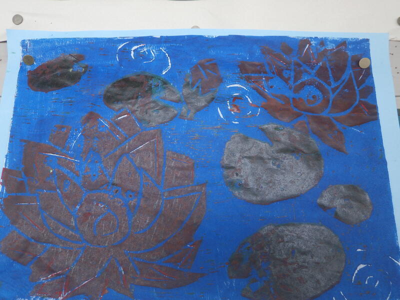 5年生の廊下に「多色刷り版画」の作品が掲示されていました。